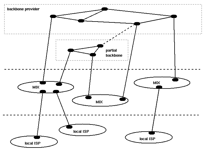 Physically, a MIX would resemble either a centralized switched backbone or a physically disperse shared media, analogous to the NAPs or MAEs today. Also similar to the NAP model, MIXes would serve a dual role, as a concentration point for traffic in the metropolitan area as well as a central point for the exchange of routing information. As noted above, it is not necessary that all traffic across the Metro cross this wire, but it will be the rule, especially for inbound traffic, rather than the exception.