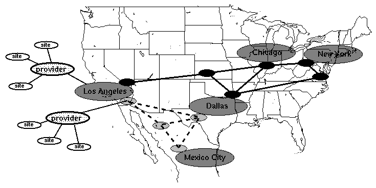 Proxied metros would relax the constraint of having backbone connections at each defined Metro, thus providing a crucial mechanism for any initial metro-based deployment. Assigned metro regions without an exchange would select a nearby exchange as a parent. Although they would number out of their assigned metro, each provider in the proxied metro would procure their own link to the nearby exchange.