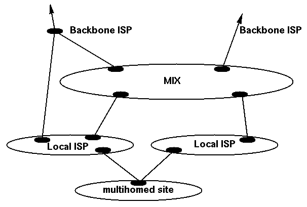 Singly connected smaller providers can still use regionals/backbone by arranging to get their customers routes carried to and advertised at the MIX by their parent provider. These small providers gain added leverage from Metro, since they have the ability to move their customers directly to another parent without disruptive renumbering.