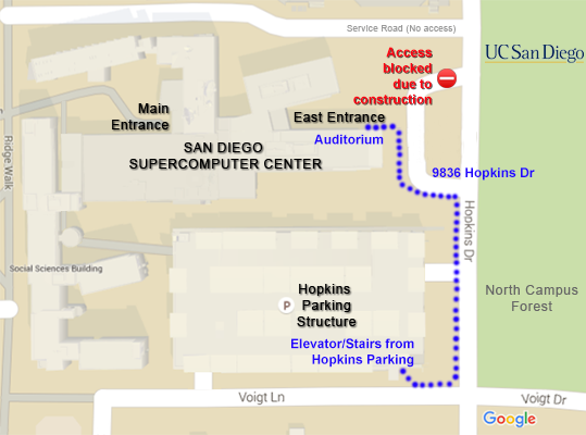 This workshop is being held in the SDSC East Auditorium (Room B210E/B211E) that faces Hopkins Drive.