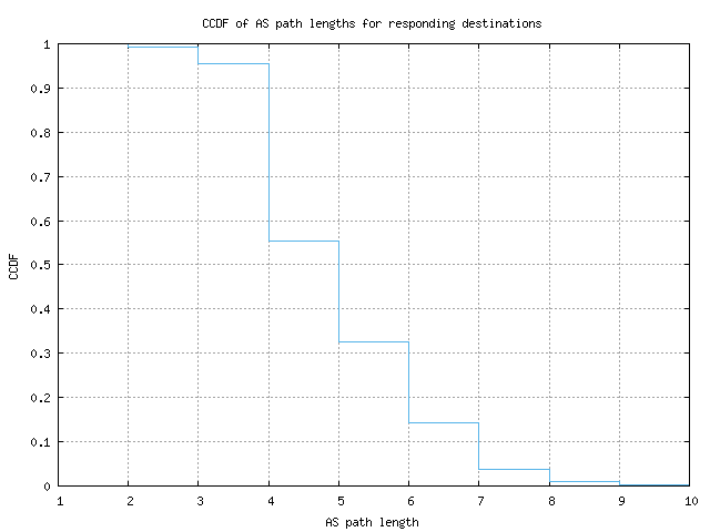 Because most AS path lengths fall within a relatively short range, the CCDF