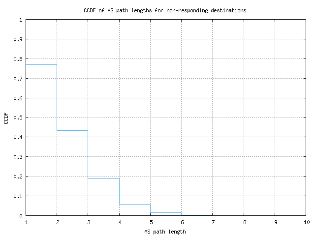 This graph shows the complementary cumulative distribution function (CCDF) of AS path lengths (number of Autonomous Systems) for probes whose destinations did not respond. The path length is instead the length to the last responding hop's AS.
