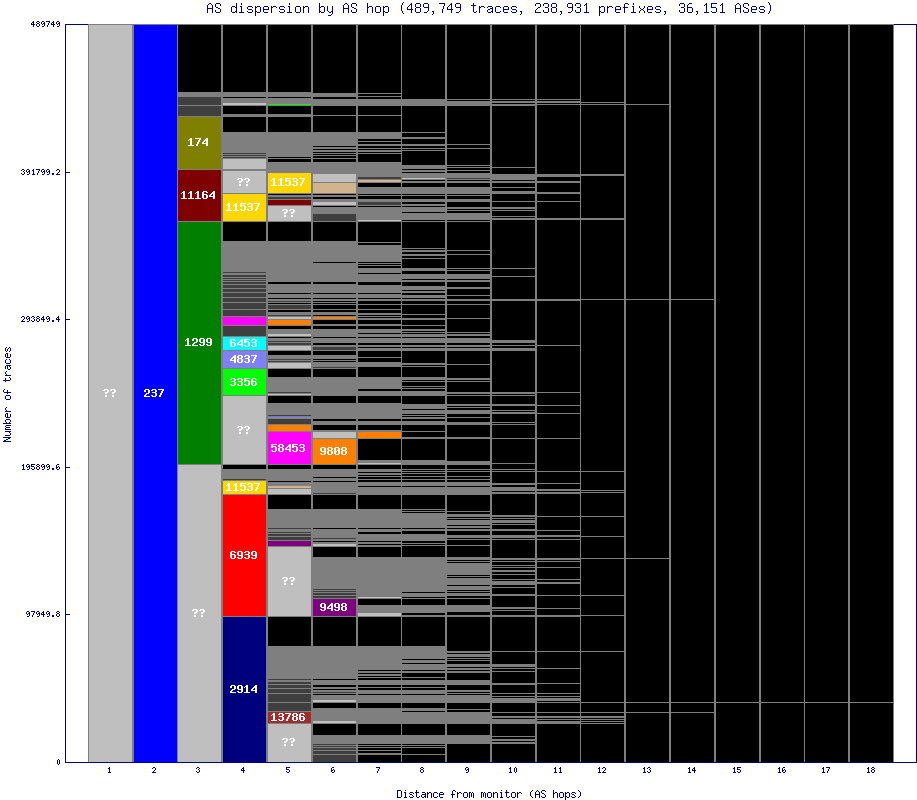 Non-grayscale colors are assigned to the ASes that show up the most, which are typically early in a path. Less numerous ASes are assigned a dark grey, whereas black is used to denote hops after the end of a particular path. Any hops with an unknown IP or AS are denoted with '??' and are colored a lighter grey.