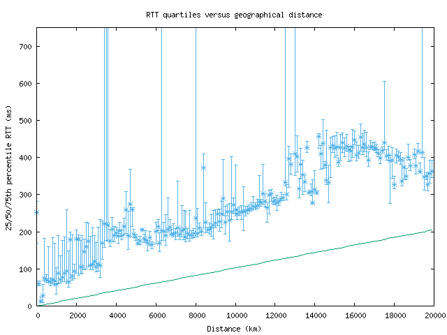 RTT quartiles versus geographical distance
