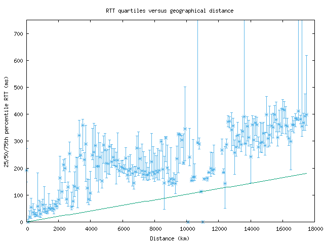 In general, a monitor with high-speed connectivity to the rest of the Internet will have median RTTs that rise linearly with distance. Unfortunately, for distances with only a few data points, the quartile view can give confusing results, with statistically unimportant but visually impressive ranges.
