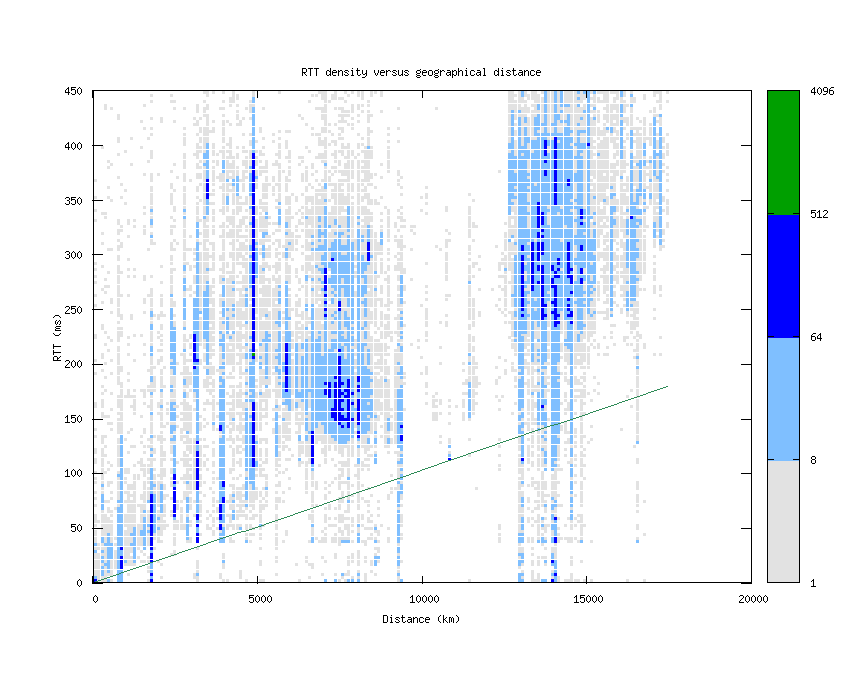 This graph shows the density of round-trip times (RTTs) versus geographical distance from the probe source. The distance is calculated by looking up every hop's latitude and longitude via NetAcuity and comparing with the location of the source. The RTTs and distances are binned (to every 3 ms and 100 km, respectively) and counted, with the color determined by the number of hops seen with that combination of RTT and distance. The straight green line represents the theoretical best RTT (given the speed of light in fiber) for a distance. The y-axis stops at 450ms, because of the occasional high-RTT result which skews the graph.