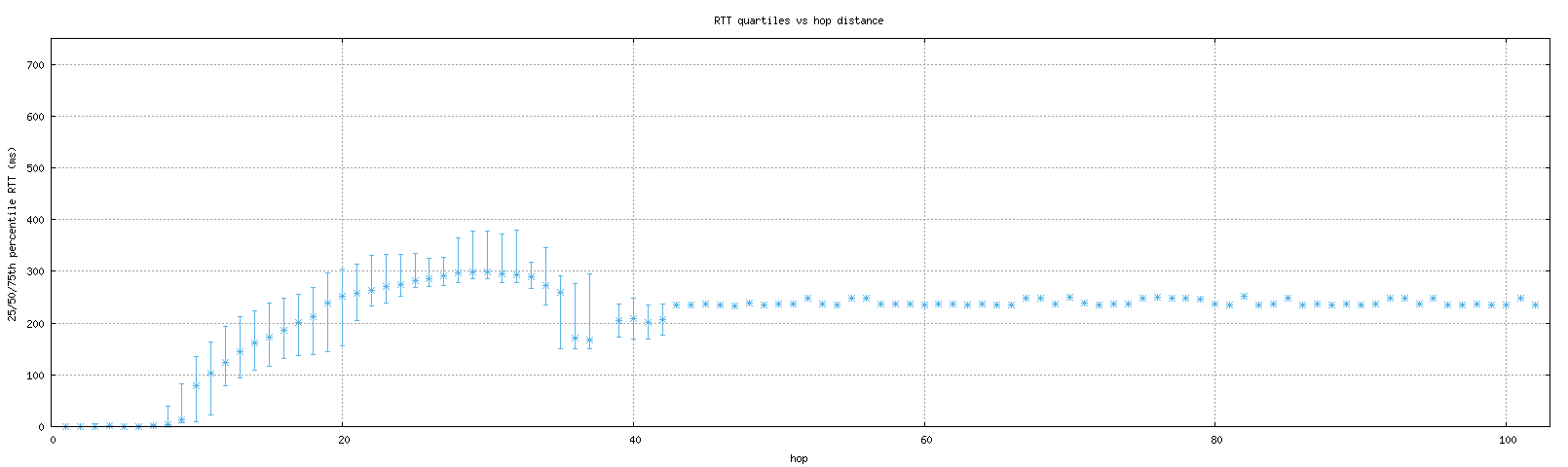 This graph shows the quartiles (25th, 50th, and 75th percentiles) of round-trip times (RTTs) found at each hop in a trace. This includes all probes, even ones that did not reach their destination. The y-axis cuts off values over 450ms, because of the occasional high-RTT result which skews the graph.