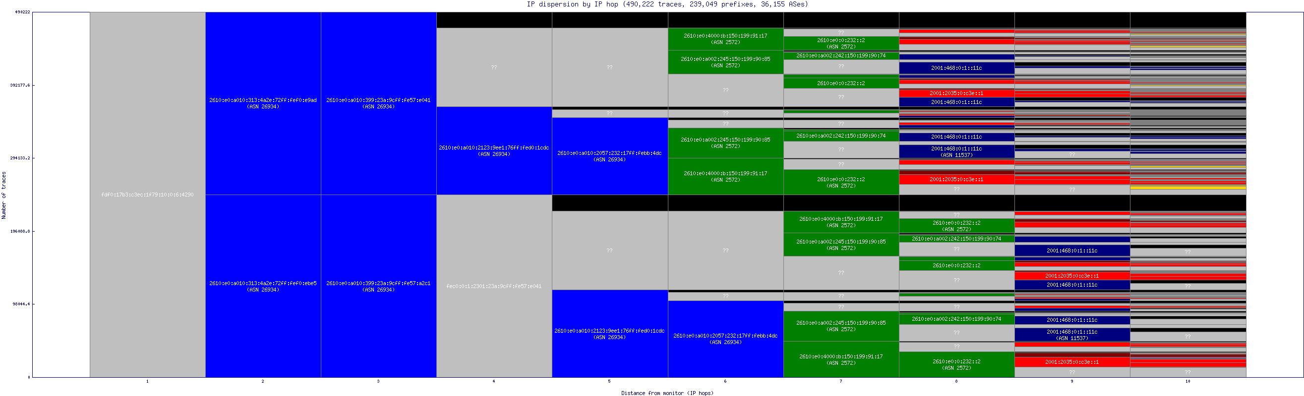 In this graph, we show the IP-level path dispersion, colored and annotated