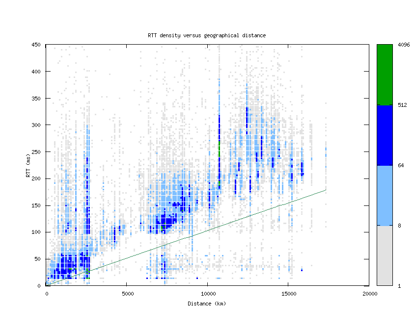 This graph shows the density of round-trip times (RTTs) versus geographical