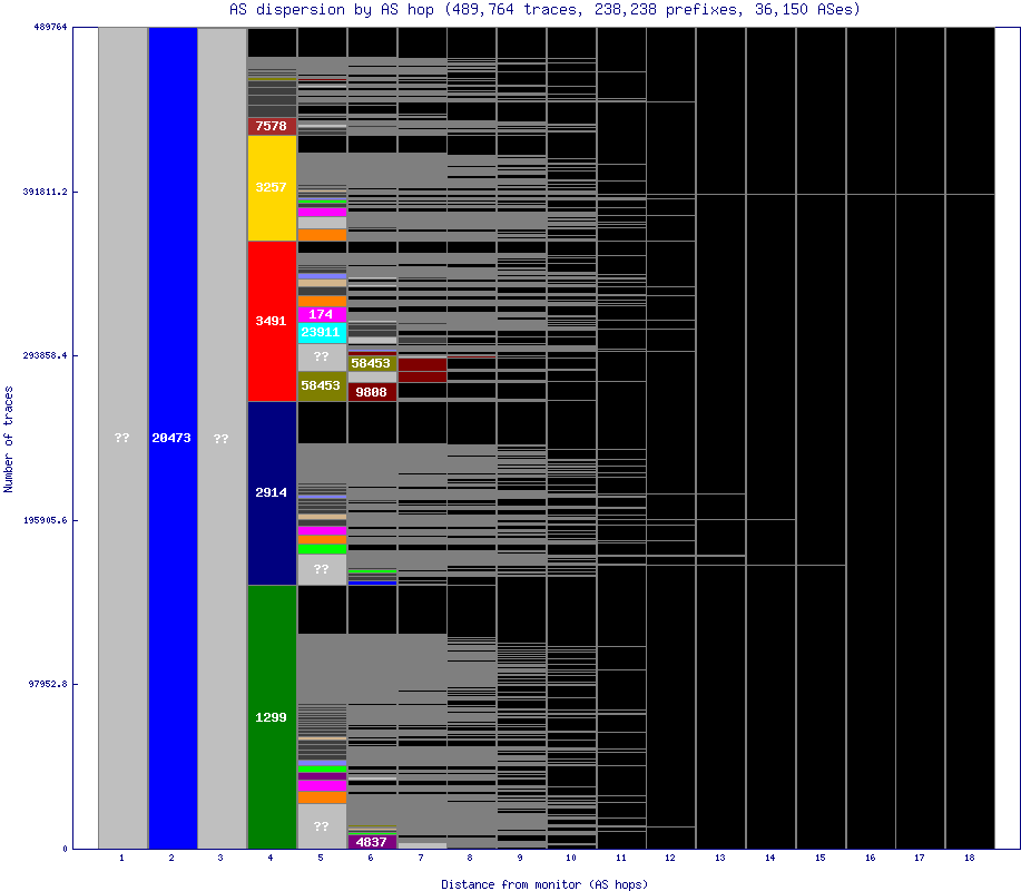 Non-grayscale colors are assigned to the ASes that show up the most, which are typically early in a path. Less numerous ASes are assigned a dark grey, whereas black is used to denote hops after the end of a particular path. Any hops with an unknown IP or AS are denoted with '??' and are colored a lighter grey.