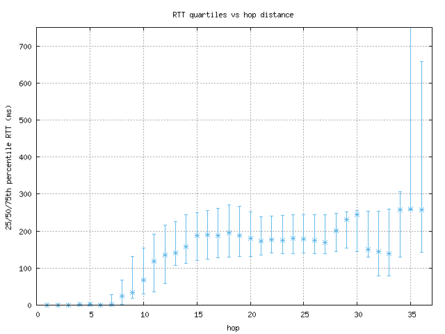 This graph shows the quartiles (25th, 50th, and 75th percentiles) of round-trip times (RTTs) found at each hop in a trace. This includes all probes, even ones that did not reach their destination. The y-axis cuts off values over 450ms, because of the occasional high-RTT result which skews the graph.
