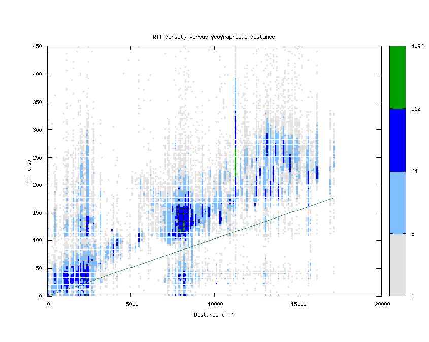This graph shows the density of round-trip times (RTTs) versus geographical distance from the probe source. The distance is calculated by looking up every hop's latitude and longitude via NetAcuity and comparing with the location of the source. The RTTs and distances are binned (to every 3 ms and 100 km, respectively) and counted, with the color determined by the number of hops seen with that combination of RTT and distance. The straight green line represents the theoretical best RTT (given the speed of light in fiber) for a distance. The y-axis stops at 450ms, because of the occasional high-RTT result which skews the graph.