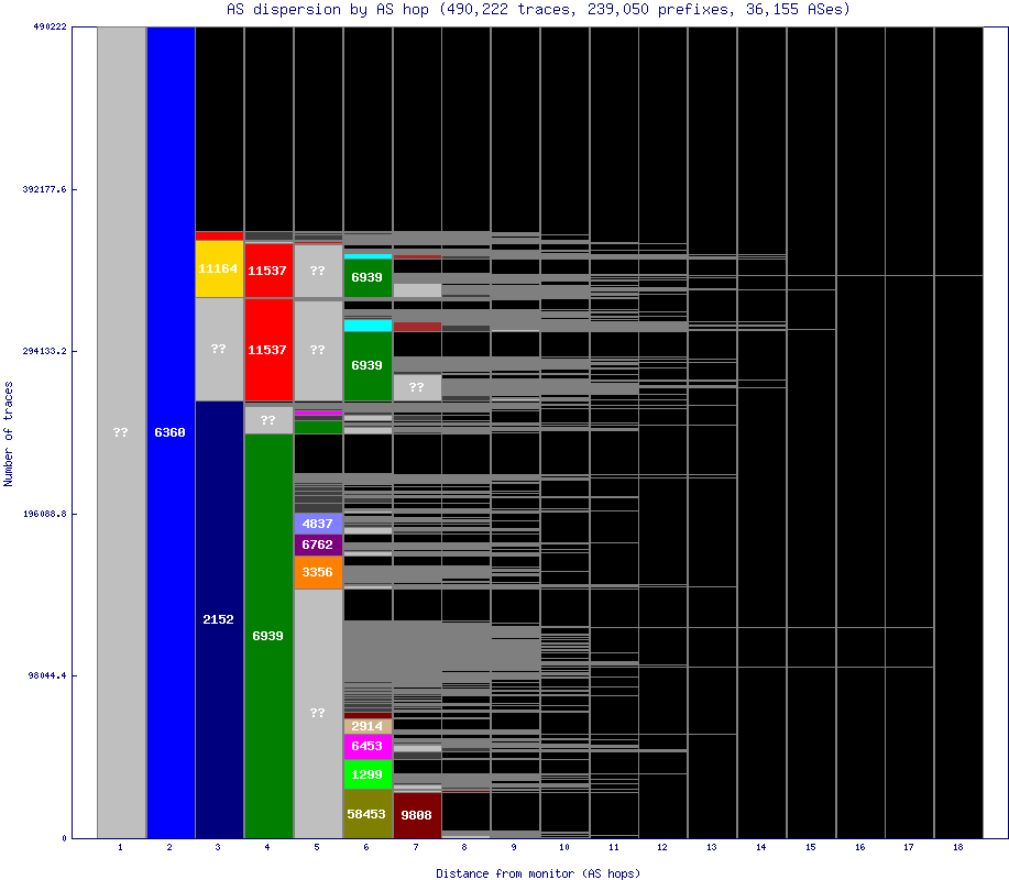 Non-grayscale colors are assigned to the ASes that show up the most, which are typically early in a path. Less numerous ASes are assigned a dark grey, whereas black is used to denote hops after the end of a particular path. Any hops with an unknown IP or AS are denoted with '??' and are colored a lighter grey.