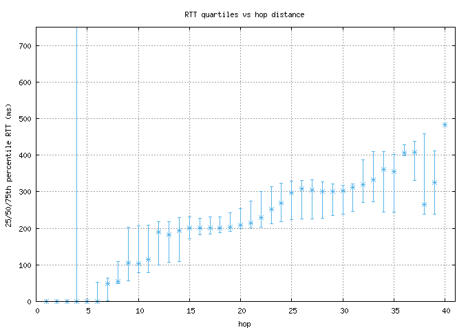 This graph shows the quartiles (25th, 50th, and 75th percentiles) of round-trip times (RTTs) found at each hop in a trace. This includes all probes, even ones that did not reach their destination. The y-axis cuts off values over 450ms, because of the occasional high-RTT result which skews the graph.