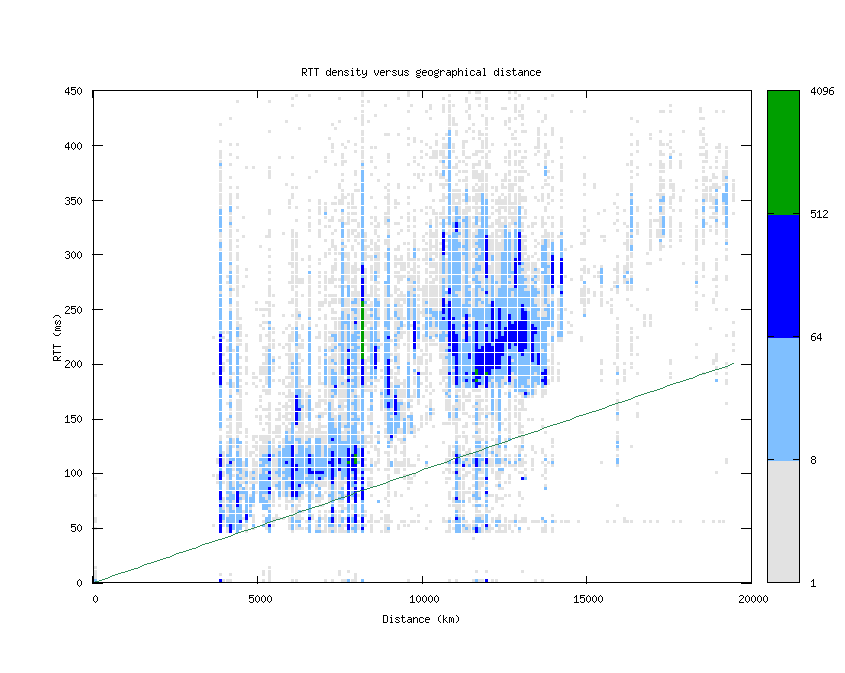This graph shows the density of round-trip times (RTTs) versus geographical distance from the probe source. The distance is calculated by looking up every hop's latitude and longitude via NetAcuity and comparing with the location of the source. The RTTs and distances are binned (to every 3 ms and 100 km, respectively) and counted, with the color determined by the number of hops seen with that combination of RTT and distance. The straight green line represents the theoretical best RTT (given the speed of light in fiber) for a distance. The y-axis stops at 450ms, because of the occasional high-RTT result which skews the graph.