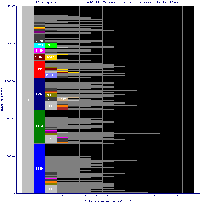In this graph, we show the AS-level path dispersion, where all adjacent hops within the same AS are collapsed into a single hop. Typically, the first hop will be all one AS (ie, the local network that the monitor is in), with the second or third hop starting to split into different ASes as probes go to their destinations. This is seen as one solid contiguous column with several smaller column segments to its right.