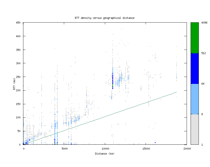 This graph shows the density of round-trip times (RTTs) versus geographical