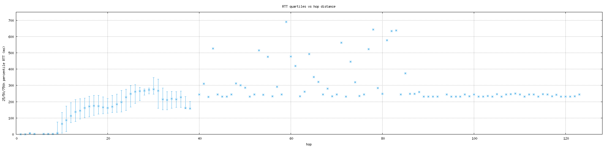 This graph shows the quartiles (25th, 50th, and 75th percentiles) of round-trip times (RTTs) found at each hop in a trace. This includes all probes, even ones that did not reach their destination. The y-axis cuts off values over 450ms, because of the occasional high-RTT result which skews the graph.