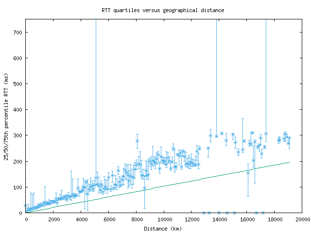 In general, a monitor with high-speed connectivity to the rest of the Internet will have median RTTs that rise linearly with distance. Unfortunately, for distances with only a few data points, the quartile view can give confusing results, with statistically unimportant but visually impressive ranges.
