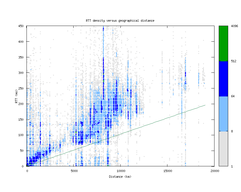 This graph shows the density of round-trip times (RTTs) versus geographical distance from the probe source. The distance is calculated by looking up every hop's latitude and longitude via NetAcuity and comparing with the location of the source. The RTTs and distances are binned (to every 3 ms and 100 km, respectively) and counted, with the color determined by the number of hops seen with that combination of RTT and distance. The straight green line represents the theoretical best RTT (given the speed of light in fiber) for a distance. The y-axis stops at 450ms, because of the occasional high-RTT result which skews the graph.