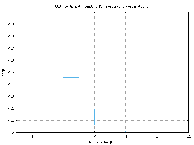 This graph shows the complementary cumulative distribution function (CCDF) of AS path lengths (number of Autonomous Systems) to a destination that responds to probing.