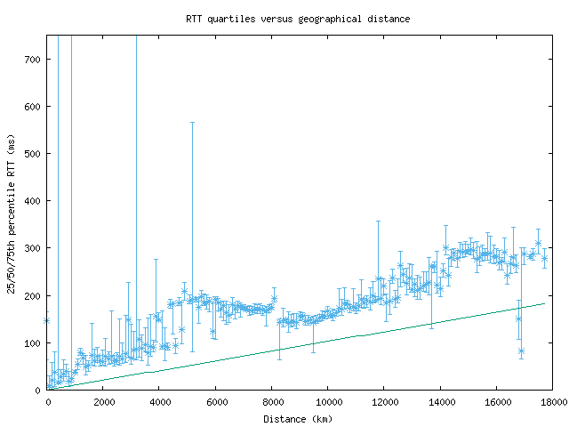 In general, a monitor with high-speed connectivity to the rest of the Internet will have median RTTs that rise linearly with distance. Unfortunately, for distances with only a few data points, the quartile view can give confusing results, with statistically unimportant but visually impressive ranges.