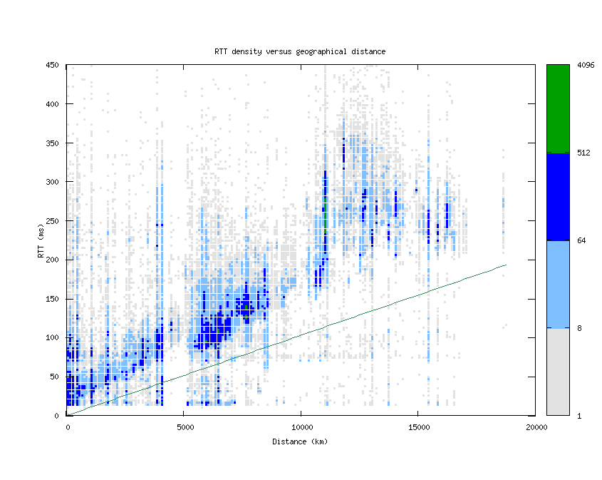 RTT density versus geographical distance