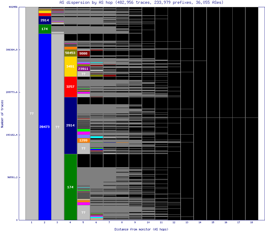 In this graph, we show the AS-level path dispersion, where all adjacent hops within the same AS are collapsed into a single hop. Typically, the first hop will be all one AS (ie, the local network that the monitor is in), with the second or third hop starting to split into different ASes as probes go to their destinations. This is seen as one solid contiguous column with several smaller column segments to its right.