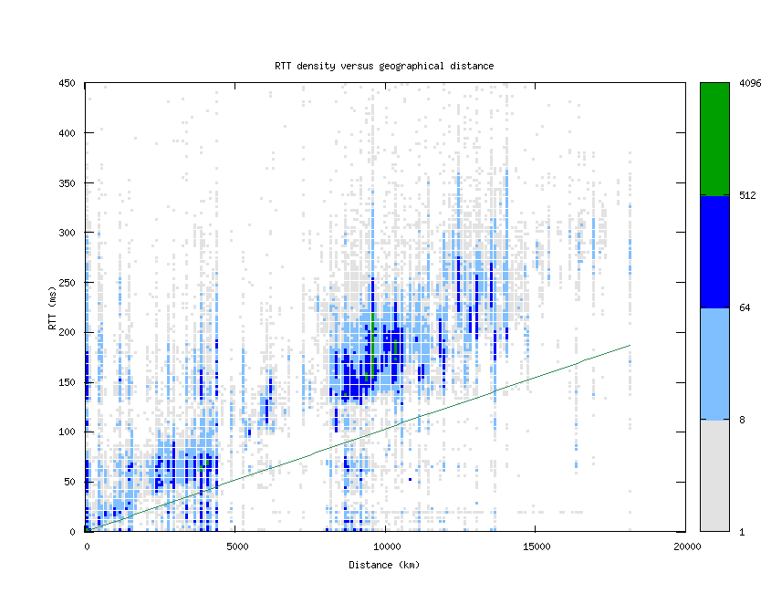 This graph shows the density of round-trip times (RTTs) versus geographical distance from the probe source. The distance is calculated by looking up every hop's latitude and longitude via NetAcuity and comparing with the location of the source. The RTTs and distances are binned (to every 3 ms and 100 km, respectively) and counted, with the color determined by the number of hops seen with that combination of RTT and distance. The straight green line represents the theoretical best RTT (given the speed of light in fiber) for a distance. The y-axis stops at 450ms, because of the occasional high-RTT result which skews the graph.