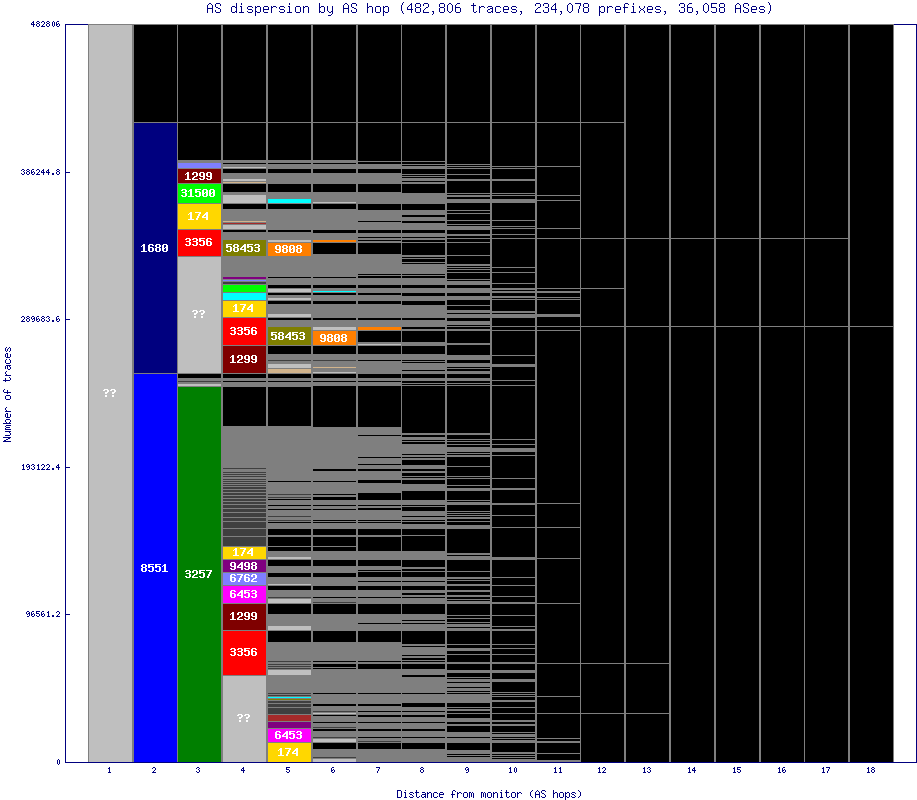Non-grayscale colors are assigned to the ASes that show up the most, which are typically early in a path. Less numerous ASes are assigned a dark grey, whereas black is used to denote hops after the end of a particular path. Any hops with an unknown IP or AS are denoted with '??' and are colored a lighter grey.