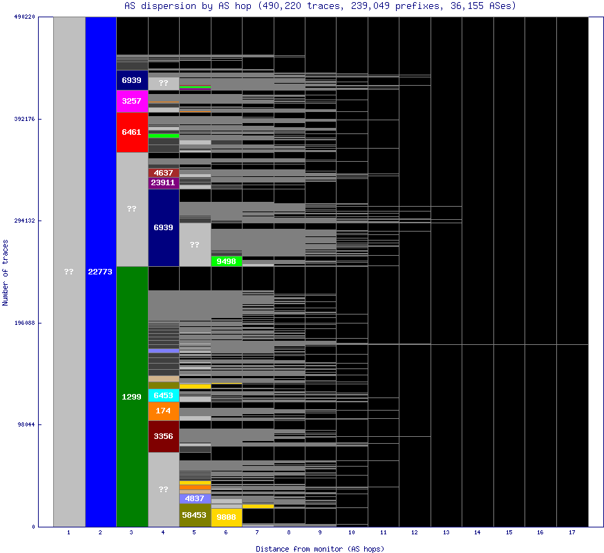 Non-grayscale colors are assigned to the ASes that show up the most, which are typically early in a path. Less numerous ASes are assigned a dark grey, whereas black is used to denote hops after the end of a particular path. Any hops with an unknown IP or AS are denoted with '??' and are colored a lighter grey.