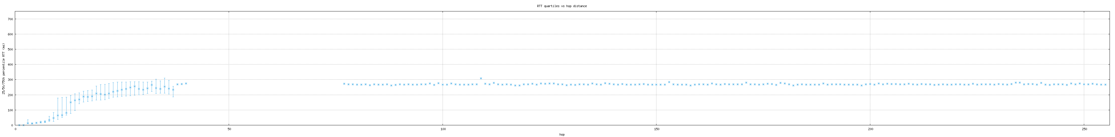 This graph shows the quartiles (25th, 50th, and 75th percentiles) of round-trip times (RTTs) found at each hop in a trace. This includes all probes, even ones that did not reach their destination. The y-axis cuts off values over 450ms, because of the occasional high-RTT result which skews the graph.
