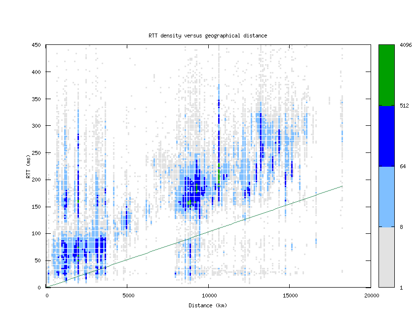 This graph shows the density of round-trip times (RTTs) versus geographical distance from the probe source. The distance is calculated by looking up every hop's latitude and longitude via NetAcuity and comparing with the location of the source. The RTTs and distances are binned (to every 3 ms and 100 km, respectively) and counted, with the color determined by the number of hops seen with that combination of RTT and distance. The straight green line represents the theoretical best RTT (given the speed of light in fiber) for a distance. The y-axis stops at 450ms, because of the occasional high-RTT result which skews the graph.