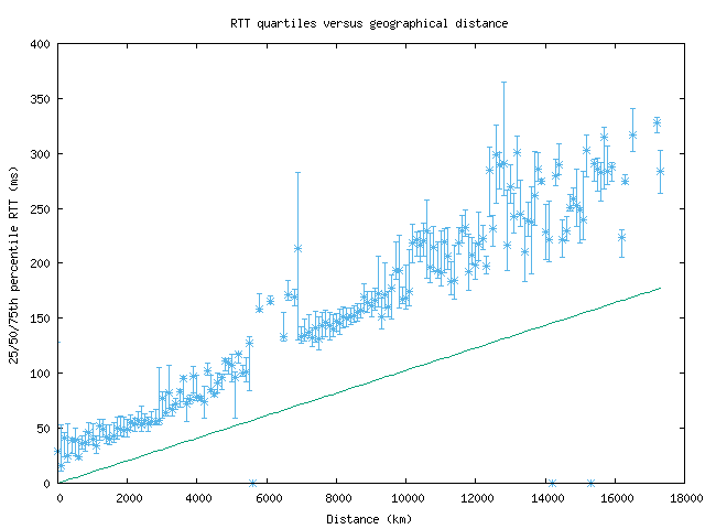 percentiles) of round-trip times (RTTs) versus geographical distance from