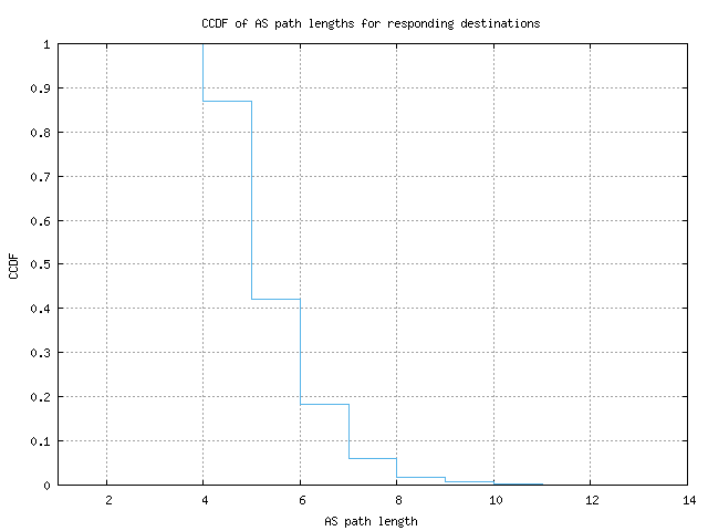 Because most AS path lengths fall within a relatively short range, the CCDF