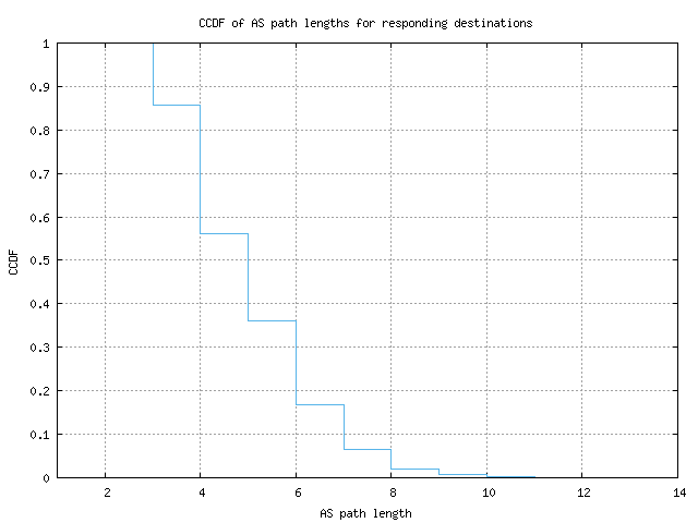 Because most AS path lengths fall within a relatively short range, the CCDF