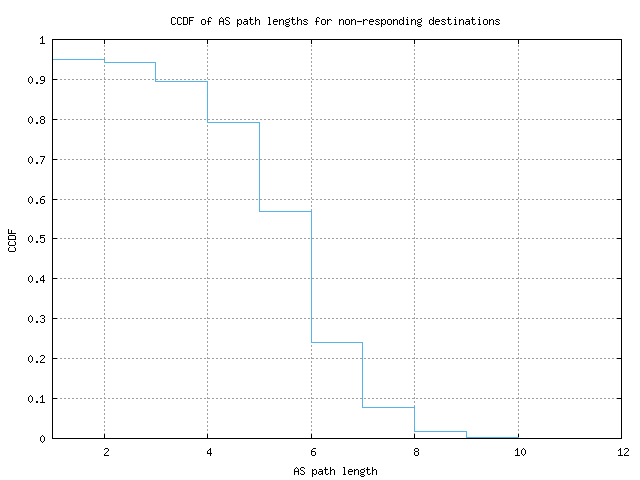 This graph shows the complementary cumulative distribution function (CCDF) of AS path lengths (number of Autonomous Systems) for probes whose destinations did not respond. The path length is instead the length to the last responding hop's AS.