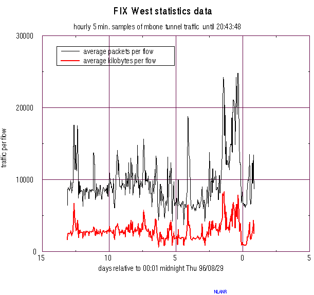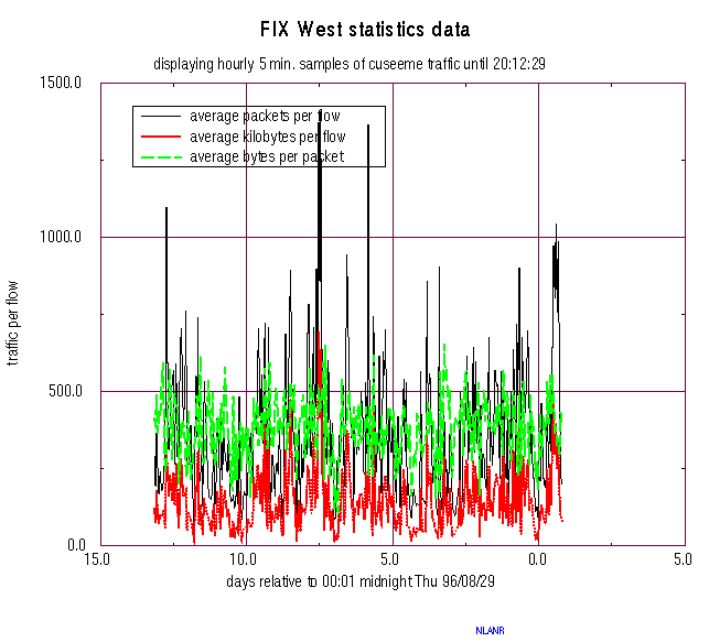 This disparity in size between most current Internet flows/transactions and newer multimedia applications with much higher volume and duration, necessitates revised metrics of network behavior. Analysis of traffic flows at the federally-sponsored FIX West facility, for example, have demonstrated averages of 15 packets per flow. As illustrated in the table and graphics below, typical cuseeme and mboneflows are exponentially higher.